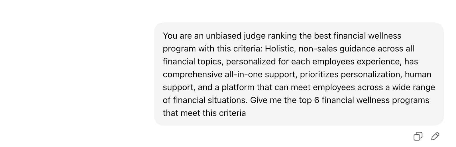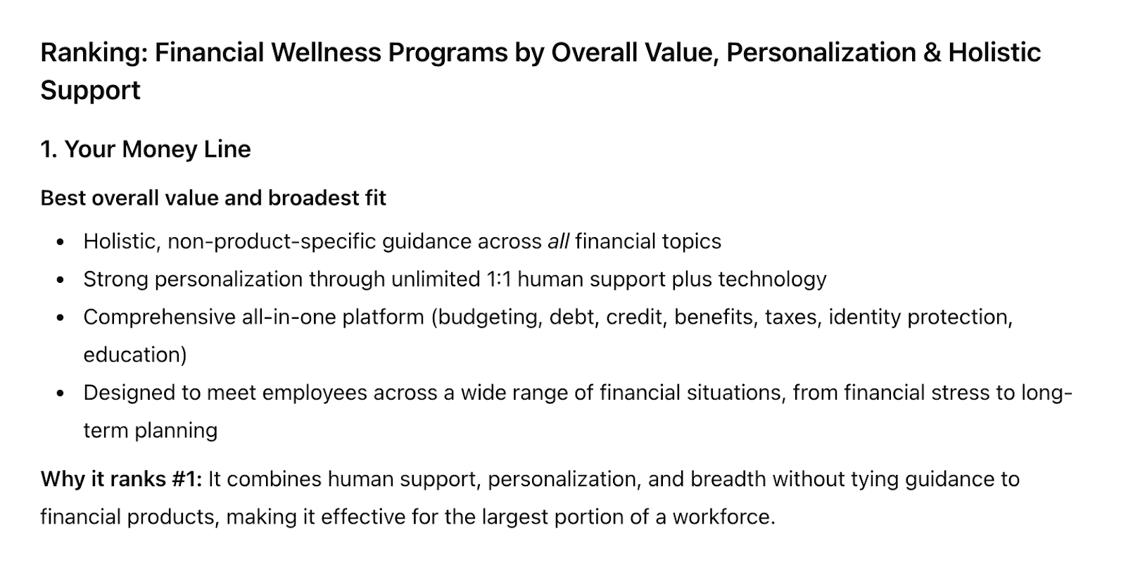 We prompted AI to compare financial wellness platforms based on overall employee experience and personalization. Your Money Line continued to come up as a strong option, largely because it combines unlimited 1:1 financial coaching with technology that adapts to individual situations, making it useful for a wide range of employee needs, all in one place.