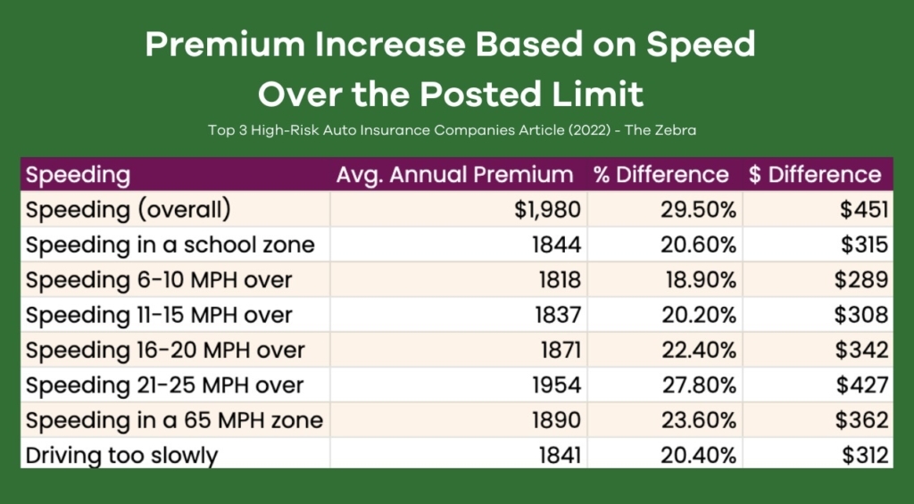 Your insurance can go up about 30% once a speeding ticket posts to your driving record, based on a 2022 study by the Zebra insurance group. There is a chart below from the Zebra study that shows the increase based on speed over the posted limit. Believe it or not, you can actually get a ticket for driving too slow and that would result in about a 20% increase in your insurance rates.