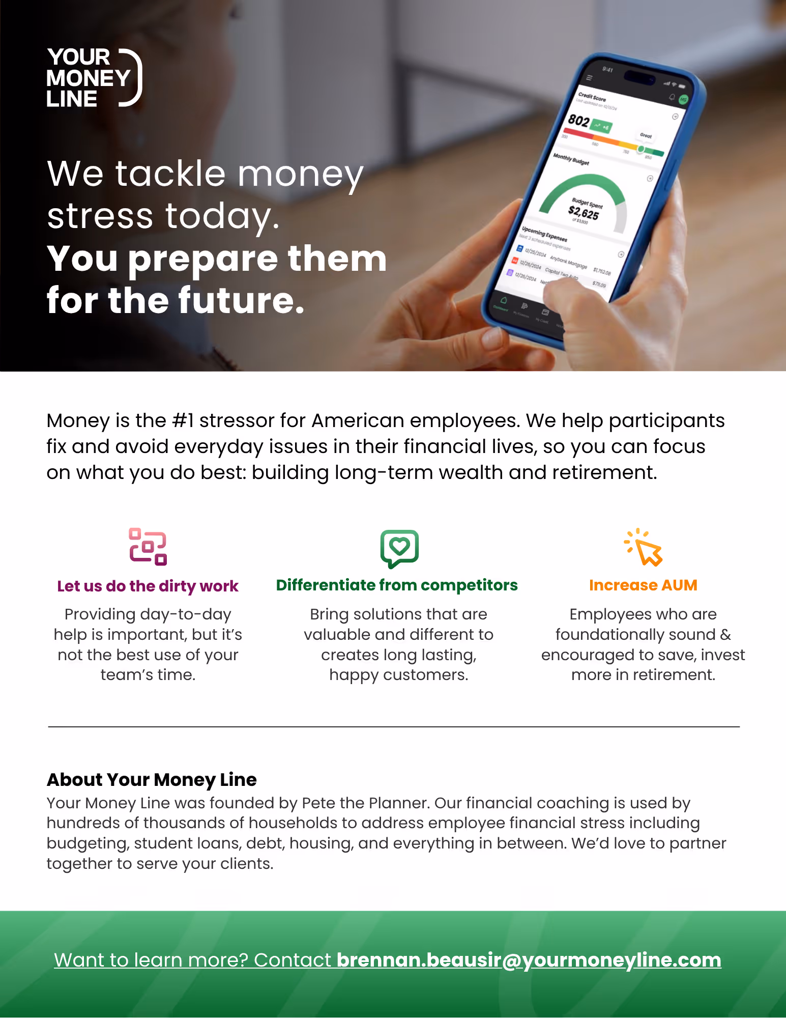 RIAs partner with Your Money Line to offload the day-to-day financial stress conversations that take up time but don’t directly build AUM. By helping employees resolve issues like debt, budgeting, or student loans, YML clears the path so participants are more financially stable and ready to save and invest. As a result, employees tend to contribute more to retirement plans, which drives long-term AUM growth.